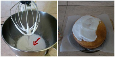 In einer Küchenmaschine geben wir ein Eiweiß und schlagen es bei hoher Geschwindigkeit etwa 15 Sekunden lang. An diesem Punkt beginnen wir, den Zucker nach und nach hinzuzufügen, bis die Mischung glänzend, schneeweiß und ziemlich dicht aussieht; das Royal Icing muss, wenn es von der Rührschüssel herunterfließt, „schreiben“, d. h. deutliche Spuren hinterlassen. Falls erforderlich, können wir noch etwas Zucker hinzufügen. Wir aromatisieren es mit einem Teelöffel Zitronen-, Orangen- oder Mandarinensaft. Wie auf dem rechten Bild zu sehen ist, läuft die Glasur nicht vom Casatiello ab, sobald sie aufgetragen ist. Schalten wir den Ofen aus und holen wir den Kuchen sofort heraus. Mit einer Spachtel bedecken wir sofort den Casatiello mit der Glasur (ganz oder nur den oberen Teil). Bestreuen wir ihn mit bunten Streuseln und geben wir den Kuchen wieder in den Ofen. Auf diese Weise trocknet und pasteurisiert die Restwärme des Ofens das Royal Icing. Das Royal Icing ist fertig, sobald es sich bei Berührung hart anfühlt und seinen Glanz verloren hat (das dauert etwa 10 Minuten). Der süße Casatiello hält sich tagelang; tatsächlich kann er auch eine Woche vor den Feiertagen hergestellt und dann in einer Kuchenbox oder in einem Brotsack aufbewahrt werden. Mit der Zeit wird er immer besser.