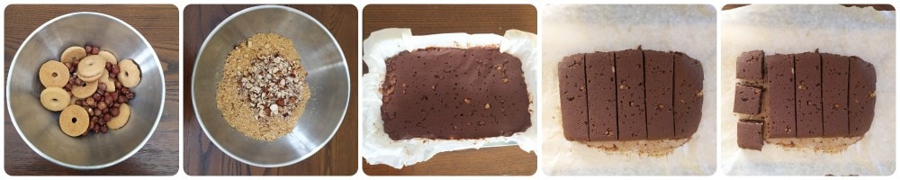 Die quadrate mit Schokolade und Haselnüssen sind köstliche Süßigkeiten, die nicht gebacken werden müssen. Dieses unwiderstehliche Dessert kann auch mit glutenfreien Keksen und laktosefreier Butter zubereitet werden. Sie sind schnell und sehr einfach zuzubereiten und werden sowohl Erwachsene als auch Kinder erfreuen. Ideal für Partys, als Nachmittagssnack, als Riegel für Sportler oder als Abschluss eines Mittagessens, begleitet von einem guten Kaffee. Die quadrate mit Schokolade und Haselnüssen können weit im Voraus zubereitet und mindestens 4/5 Tage im Kühlschrank aufbewahrt werden, wobei sie immer besser werden. Die Kombination aus dunkler Schokolade und Haselnüssen ist eine meiner Lieblingskombinationen und perfekt für köstliche Süßigkeiten.