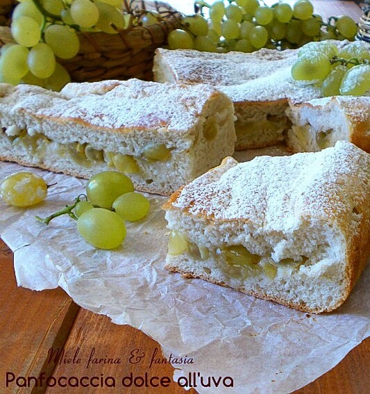 Das Haus, das wie eine Konditorei riecht, ist eine große Befriedigung, denn das bedeutet, dass wir gut gearbeitet haben und dass unsere „Mühen“ belohnt wurden. Mit Sauerteig zu backen kann anspruchsvoller sein als mit Hefe zu backen; der Sauerteig muss nämlich buchstäblich „gepflegt“ werden, er braucht Pflege und Aufmerksamkeit, um seine volle Stärke entfalten zu können, aber das bedeutet nicht, dass es schwierig ist, ihn zu verwenden. Man braucht nur ein wenig Übung und viel Liebe zur Küche. Meine letzte „Kreation“ aus dem Ofen mit Sauerteig ist ein superweiches Panfocaccia gefüllt mit weichen, saftigen und süßen Trauben. Es ist keine Neuinterpretation der toskanischen Trauben-Schüttelpizza; es ist ein Dessert, um den Herbst zu begrüßen, anders als üblich und das wir zu jeder Zeit genießen können, da es leicht wie eine Wolke und laktosefrei ist, es enthält weder Butter noch Eier. Das Verfahren zur Herstellung dieses weichen Traubendesserts mag lang erscheinen, aber in Wirklichkeit garantieren uns die drei Gärungen (einschließlich der des Sauerteigs) ein weicheres, verdaulicheres und haltbareres Endprodukt.