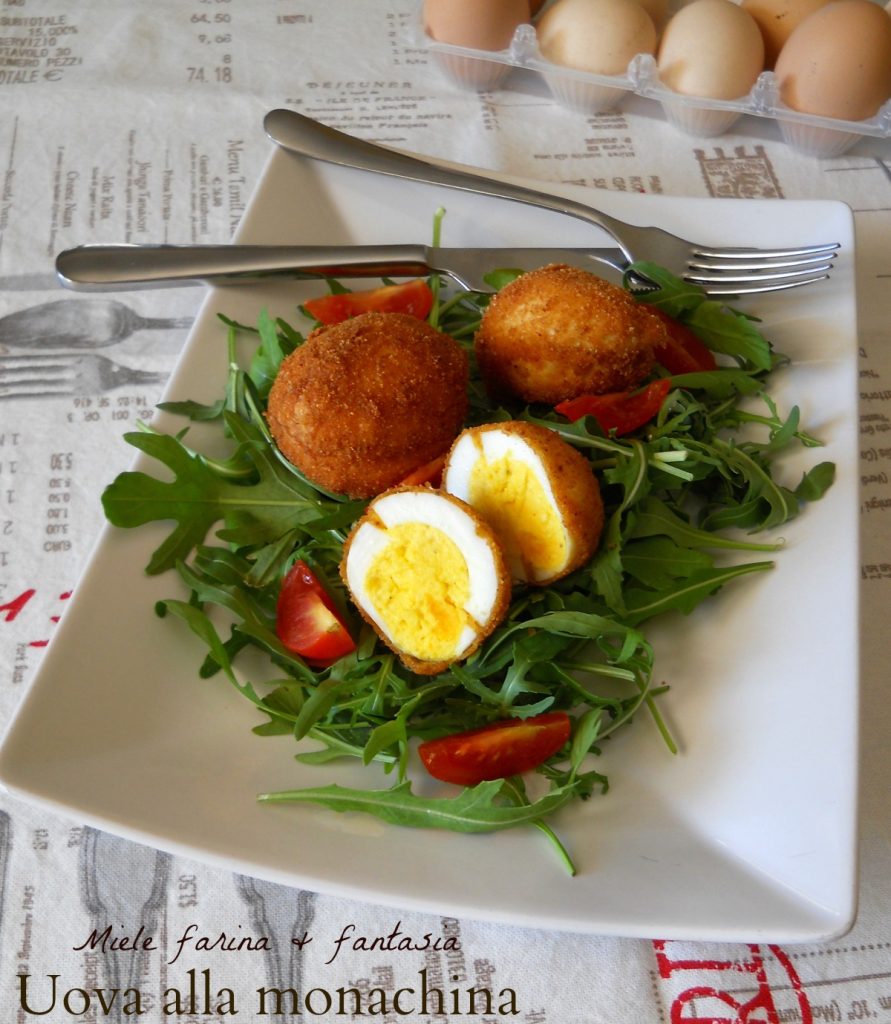 6) Die zusammengesetzten Eier zuerst in den Semmelbröseln, dann im Ei und erneut in den Semmelbröseln wälzen. Nacheinander in heißem, tiefem Öl für maximal 2 oder 3 Minuten frittieren. Abtropfen lassen und auf einen Teller mit saugfähigem Papier legen. Die Uova alla monachina mit einem reichhaltigen und frischen gemischten Salat servieren.