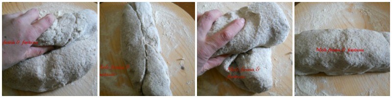 5) Wenn er sich verdoppelt hat, übertragen wir ihn auf eine Arbeitsfläche, die mit etwas Hartweizengrieß bestäubt ist, der hilft, den Teig zu trocknen, ohne ihn zu verarbeiten oder zu entleeren. Wir beginnen, den Teig um sich selbst zu wickeln, indem wir ihn zu uns hin rollen. Wir erhalten einen Zylinder, den wir erneut wickeln, beginnend von der langen Seite. Wir legen den so erhaltenen Teig in die mit Backpapier ausgelegte Form und lassen ihn abgedeckt gehen (etwa 5/6 Stunden, je nach Temperatur des Ortes, an dem er geht).