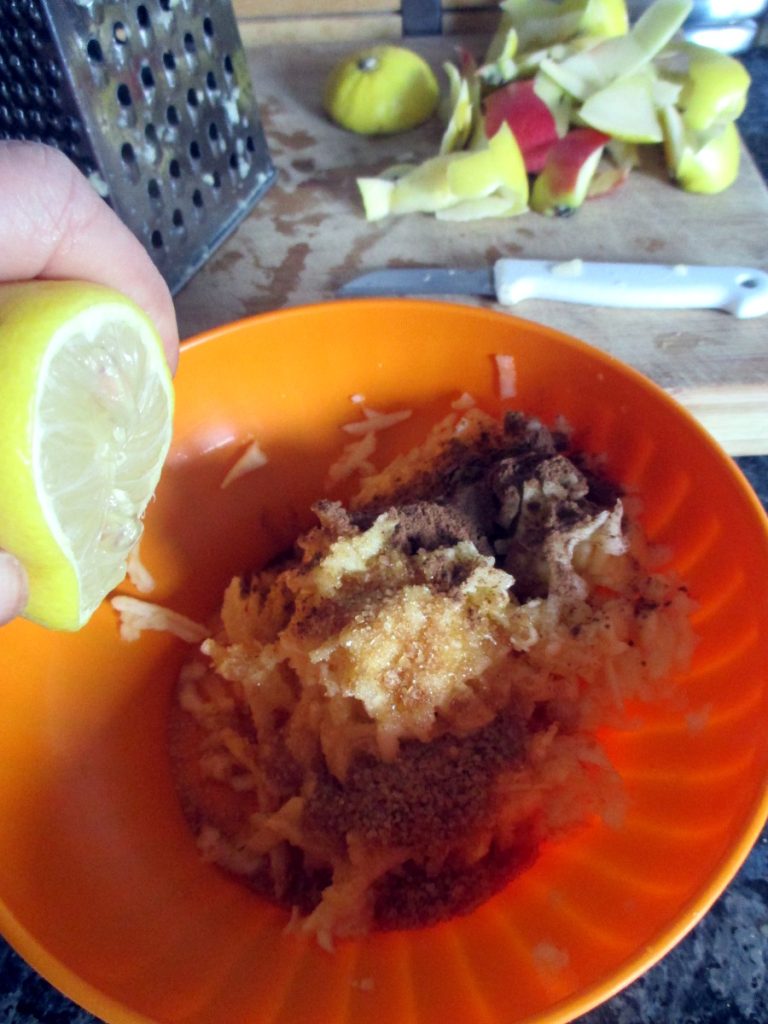 • Wasche, schäle und entkerne die 3 Äpfel, reibe sie und würze sie mit Zitronensaft, Zucker und Zimt. Gut mischen.
