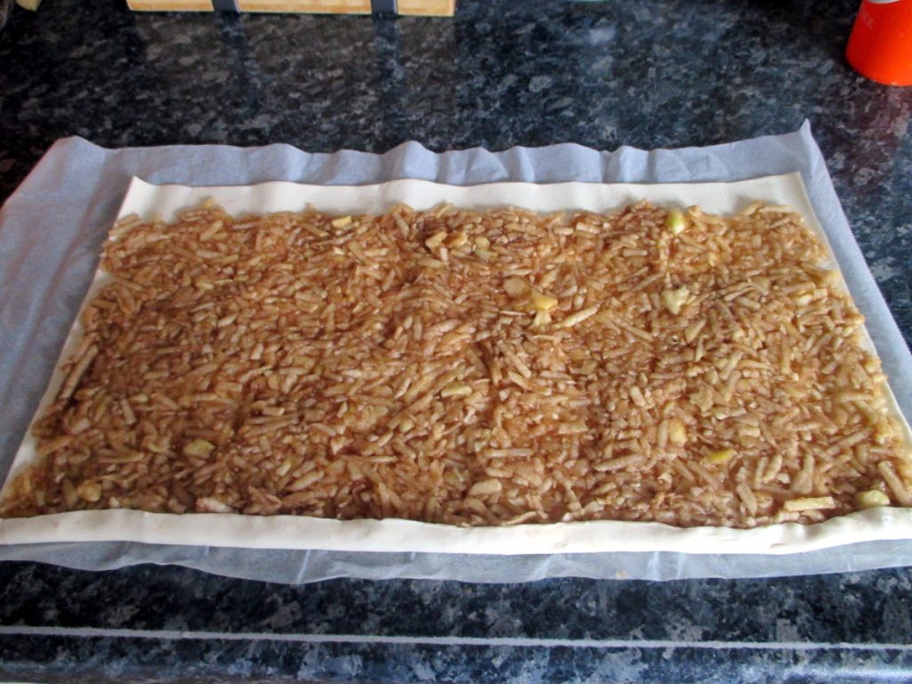 • Verteile die Äpfel gleichmäßig bis zu den Rändern, lass nur ein bisschen Platz an einer der langen Kanten, wie auf den Fotos zu sehen.