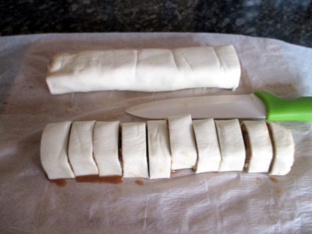 • Wenn es kalt ist, entferne es aus dem Papier und du wirst sehen, dass es leicht ist, es in 20 Scheiben von etwa 2 cm mit einem scharfen Messer zu schneiden.
