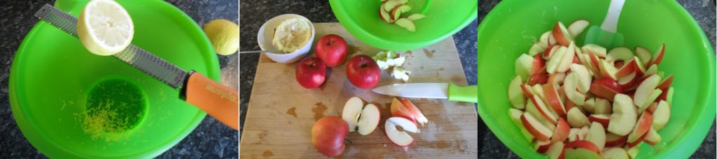 Bereite in einer Schüssel den Saft und die abgeriebene Schale einer halben Zitrone vor. Wasche die Äpfel, schneide sie viertel und entferne das Kerngehäuse. Du kannst die Äpfel mit Schale lassen oder schälen, je nach deinem Geschmack: Wenn die Äpfel biologisch sind, empfehle ich, sie gut zu waschen und die Schale dran zu lassen. Schneide die Äpfel in Scheiben und mische sie nach und nach in die Zitronensaftschüssel, damit sie nicht braun werden.