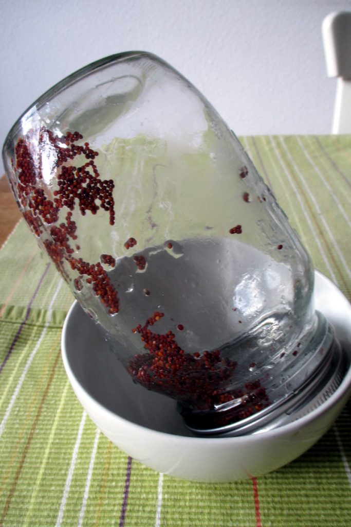 Stell das Glas entweder in den dafür vorgesehenen Ständer, wenn du einen hast, oder, wie ich es mache, schräg mit dem Netzdeckel nach unten in eine Schüssel. Dies ermöglicht es dem restlichen Wasser, abzufließen, ohne die Samen zu nass zu lassen.