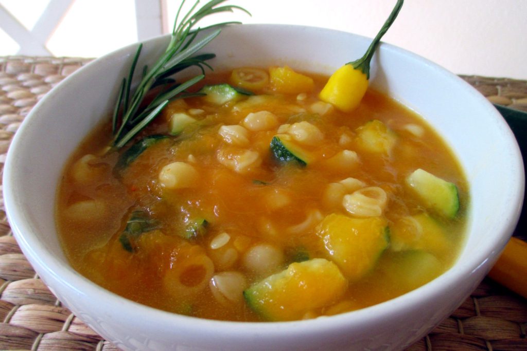 In einen großen Topf Öl, in Scheiben geschnittenen Chili und ganze oder geschnittene Knoblauchzehe geben. Sobald der Knoblauch zu braten beginnt, die Kürbiswürfel und etwas Wasser hinzufügen und sanft kochen lassen. Wenn der Kürbis anfängt weich zu werden, die Zucchiniwürfel hinzufügen und, wenn gewünscht, die Knoblauchzehe entfernen. Gerade mit Wasser bedecken, etwas Salz hinzufügen und sobald es kocht, die Nudeln hinzufügen.