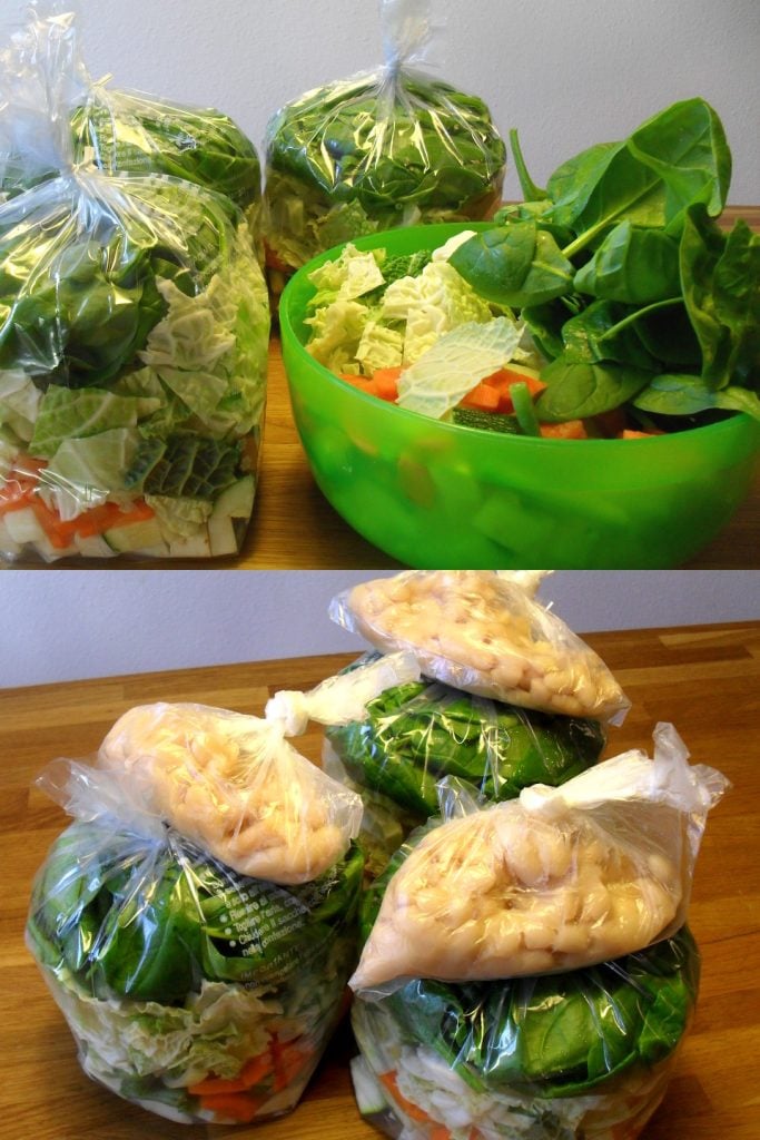 Mach dasselbe mit den Bohnen, aber lasse sie in separaten Beuteln vom Gemüse und füge sie beim Kochen zusammen mit dem anderen Gemüse hinzu. So hast du immer die Möglichkeit, den leichten Eintopf mit 0 Punkten zu machen.