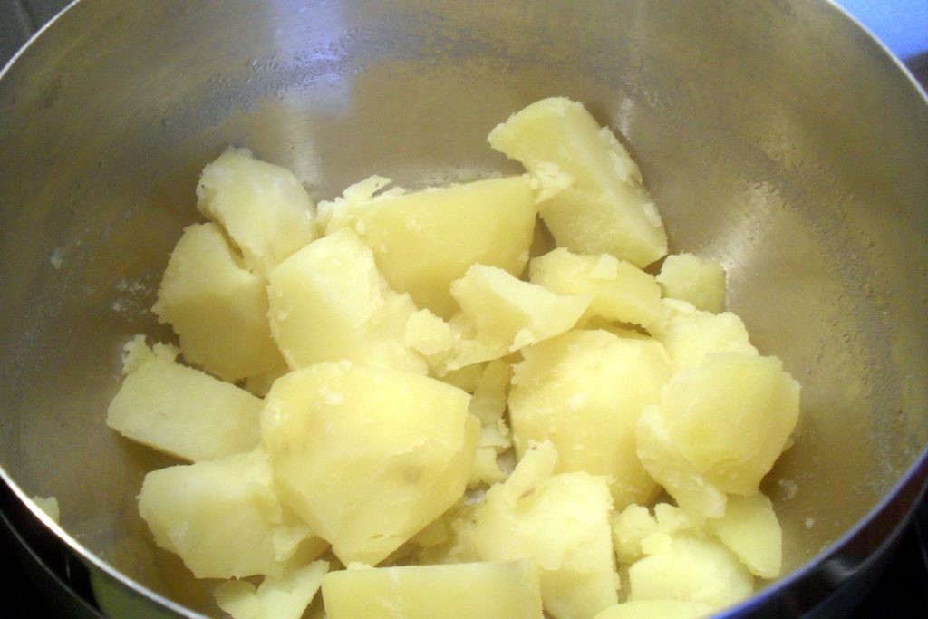 Nach 20 Minuten stecke eine Gabel in eine Kartoffel und prüfe, ob sie weich ist. Wenn die Kartoffeln zart sind, das Wasser abgießen und die Kartoffeln in den noch warmen Topf zurückgeben.