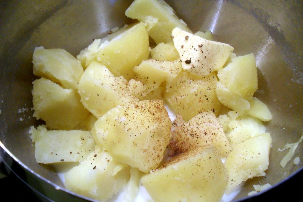 Schäle die Kartoffeln, schneide sie in Stücke und lege sie in einen Topf mit reichlich kaltem Salzwasser. Stelle den Topf auf den Herd und wenn es zu kochen beginnt, reduziere die Hitze und decke ab.
