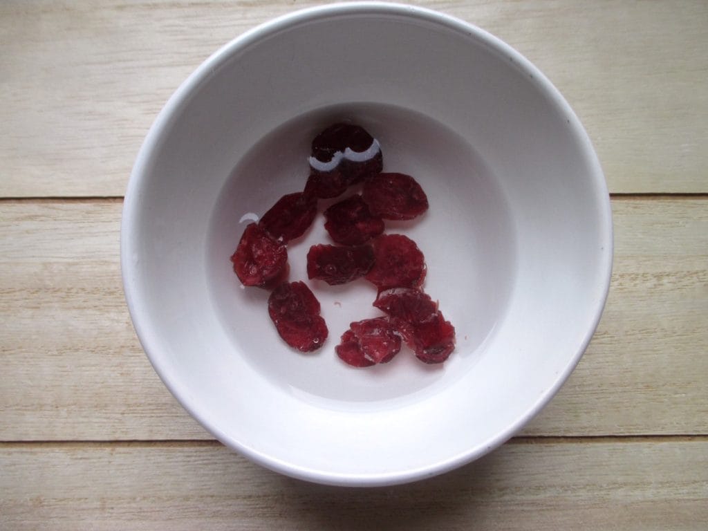 • Dann am Morgen, bevor du mit der Zubereitung beginnst, die Rosinen oder getrockneten Preiselbeeren in etwas warmem Wasser einweichen, damit sie weich werden.