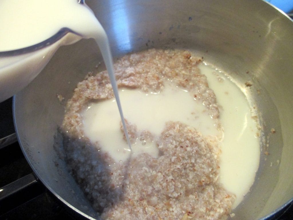 • Dann die Mandelmilch hinzufügen und weitere 2-3 Minuten kochen.