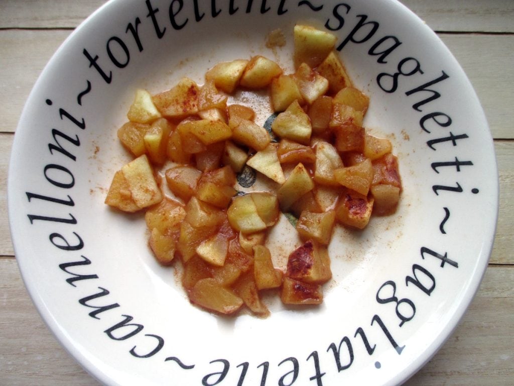 • Während das Porridge kocht, bereite den Apfel vor: Schäle ihn und schneide ihn in kleine Stücke auf einem Teller, füge die Hälfte des Agavensirups, etwas Zimt hinzu und mische gut.