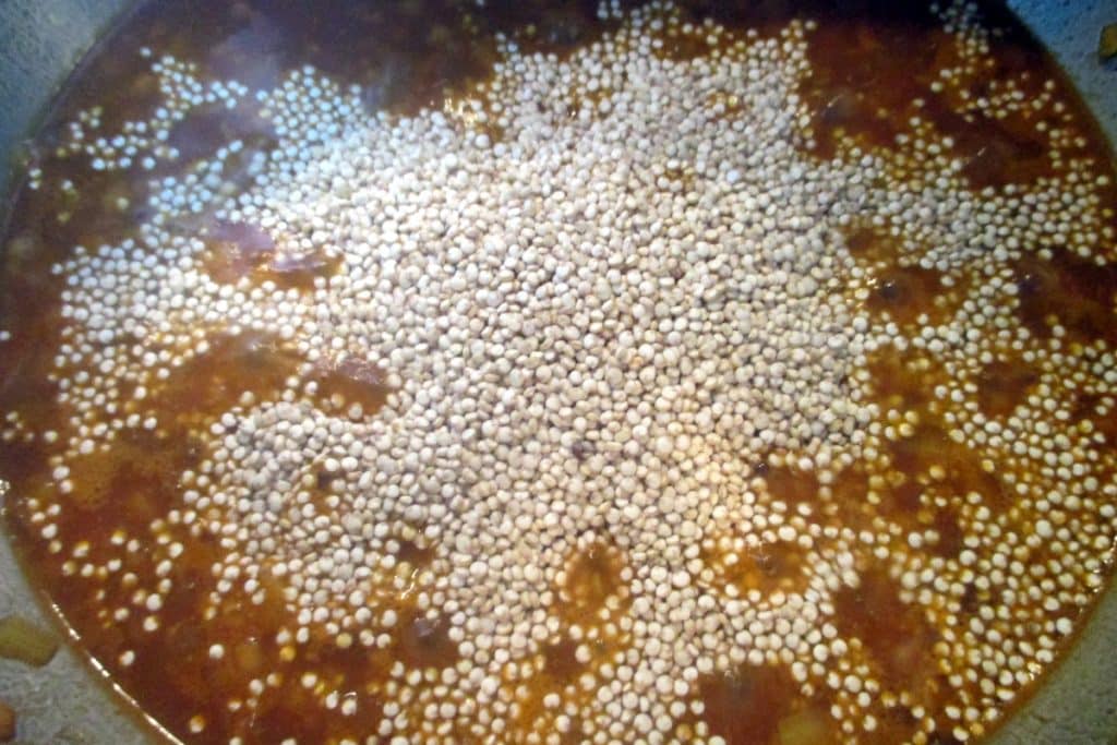 Rühre gut um, füge ein wenig Salz hinzu und lasse es bei niedriger Hitze abgedeckt weitere 15-20 Minuten köcheln, bis die Linsen und die Quinoa gar sind. Falls nötig, füge mehr Wasser hinzu.