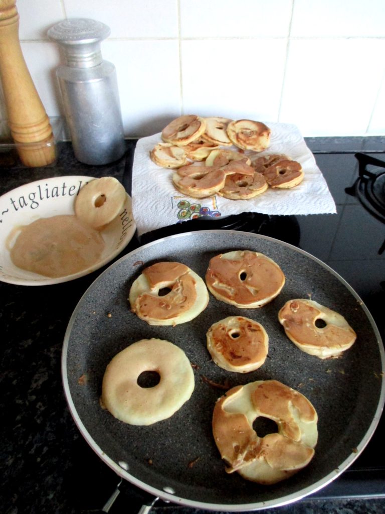 Pfannkuchen ja, aber nicht frittiert, das heißt, sie werden in der Pfanne, aber ohne Öl zubereitet: Man braucht nur eine gute Antihaftpfanne oder Crepepfanne. Das Rezept für den Teig ist ähnlich wie das meiner leichten Pfannkuchen, leicht modifiziert. Ich habe die Menge an Mehl erhöht, um den Teig dicker zu machen, und ein wenig braunen Zucker und Zimt hinzugefügt. Einfacher geht’s nicht!