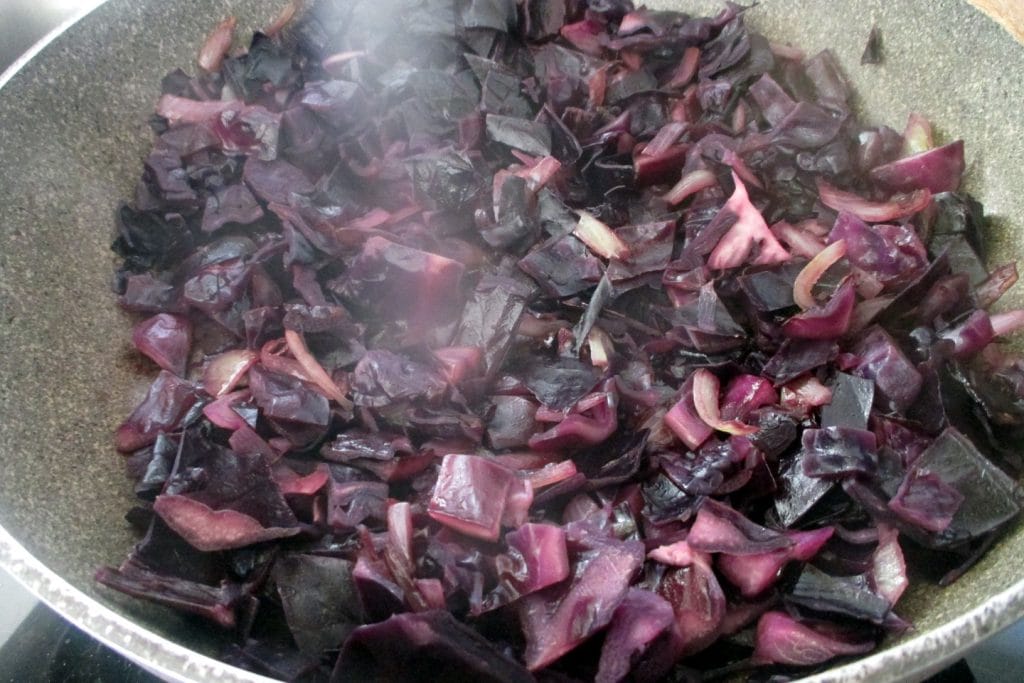 Nach ein paar Minuten fügen Sie auch den Rotkohl hinzu. Mischen Sie, fügen Sie auch ein wenig Wasser und Salz hinzu und decken Sie ab.