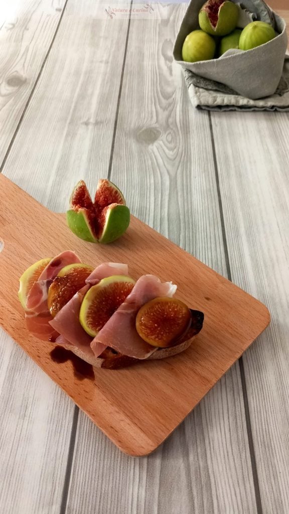 In der Zwischenzeit rösten Sie in einer Pfanne oder auf einem Grill die Brotscheiben von beiden Seiten.Sobald sie fertig sind, würzen Sie sie mit einer Scheibe Rohschinken und einer Feige, die in weniger als einen halben Zentimeter dicke Scheiben geschnitten wurde. Mit einem Teelöffel ein paar Tropfen Balsamico-Sauce darüber geben und servieren.