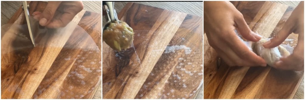 Legt eine Füllungskugel auf jedes Blatt und beginnt es zu schließen, indem ihr das Reispapier von einer Seite aus über sich selbst faltet, sodass keine offenen Enden bleiben.