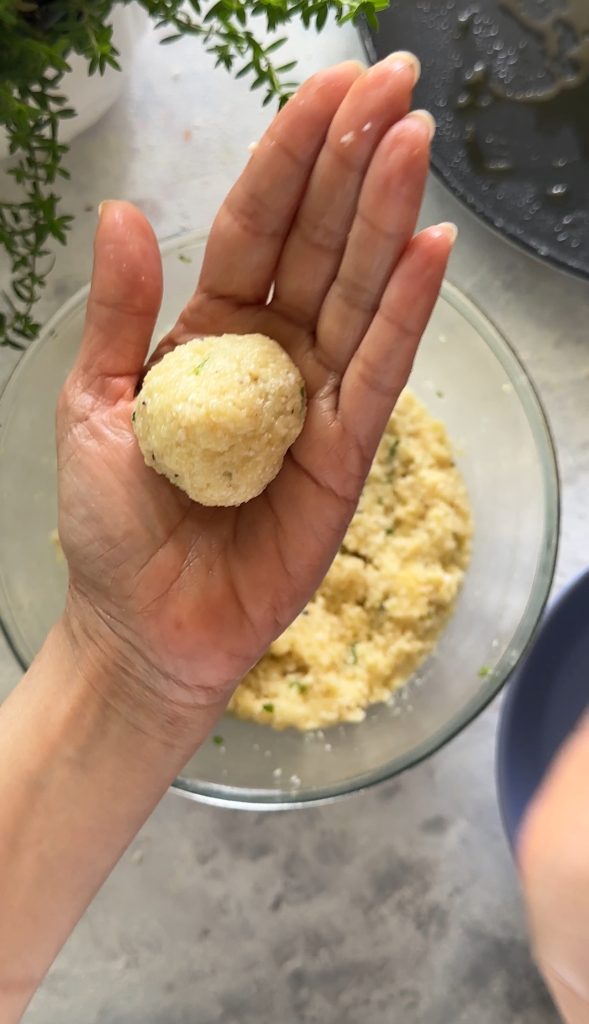Befeuchten Sie Ihre Hände, formen Sie die Pallotte, wenden Sie sie in Mehl und legen Sie sie dann in die vorgewärmte, leicht geölte Form.