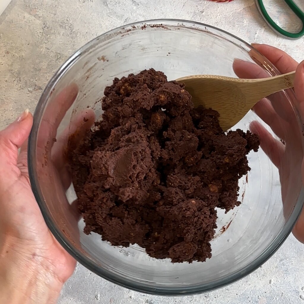 Gib die Kekse in die Schüssel und füge das Kakaopulver, das Erythrit, die Haselnüsse hinzu und vermische alles.