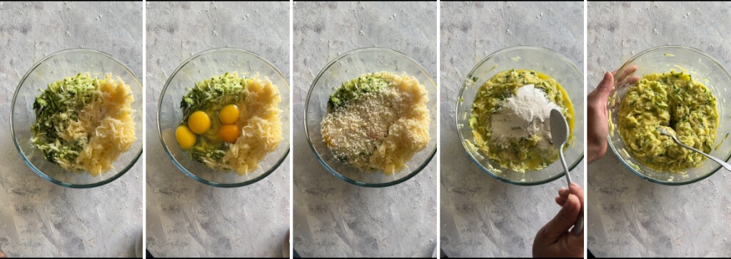 Waschen und schneiden Sie die Enden der Zucchini ab. Schälen Sie die Kartoffel und reiben Sie alles mit der Reibe mit großen Löchern. Geben Sie alles in die Schüssel und fügen Sie die Eier, den geriebenen Käse, das Salz und das Mehl hinzu. Gut umrühren.