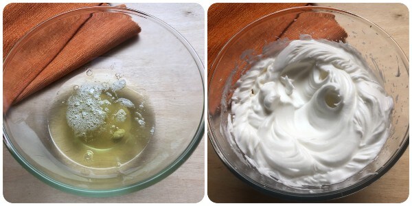 • Die Eiweiße in eine Schüssel geben, eine Prise Weinstein hinzufügen und mit den elektrischen Schneebesen steif schlagen. Beiseitelegen.