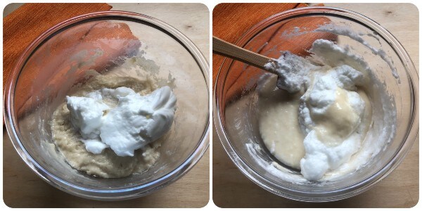 • Jetzt die steif geschlagenen Eiweiße nach und nach hinzufügen und mit einem Spatel vorsichtig von unten nach oben mischen, um ein Entlüften zu vermeiden.