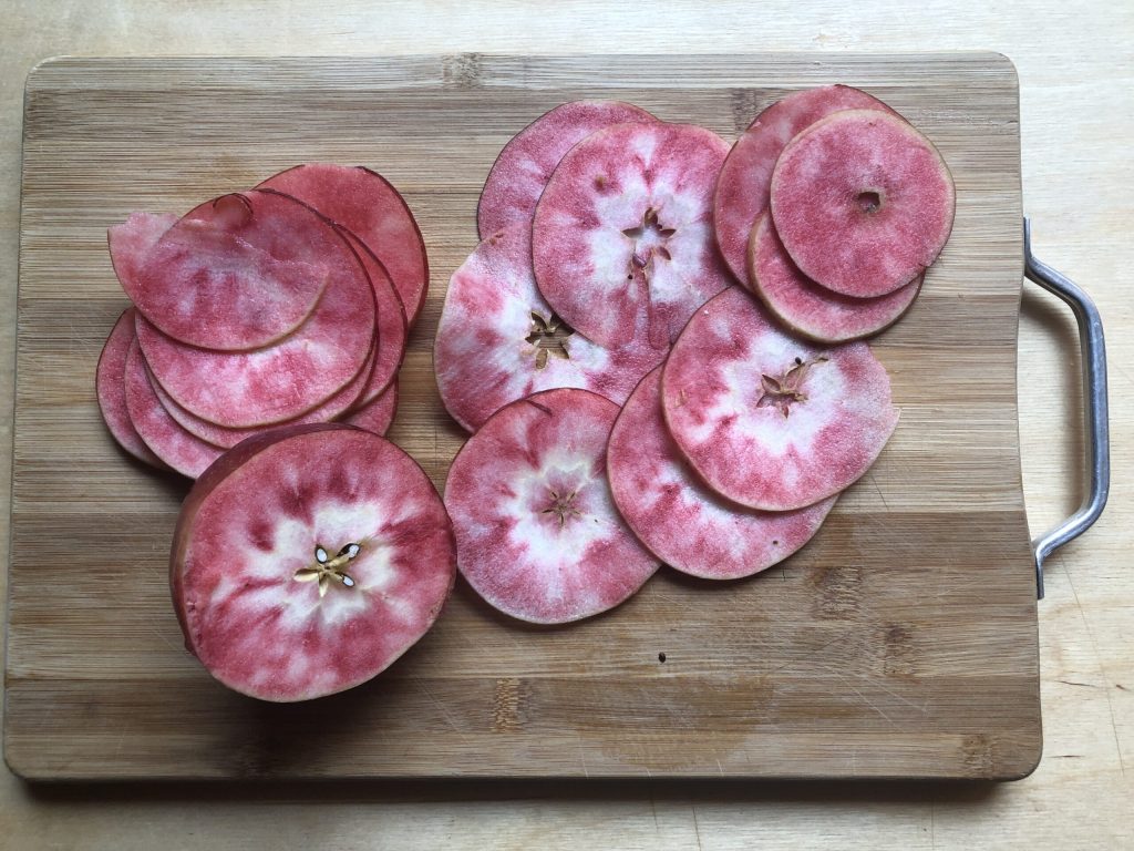 Die Äpfel waschen, trocknen und mit einer Mandoline in dünne Scheiben schneiden. Wie ihr sehen könnt, sind diese Äpfel innen rot und unglaublich lecker. Ich habe das mittlere Gehäuse nicht entfernt, sondern nur die Samen.