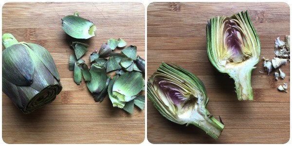 Die Artischocken putzen, indem man die äußeren harten Blätter entfernt. Die Stiele kürzen und die Spitzen entfernen. Dann längs halbieren und mit einem kleinen Messer das innere Heu entfernen.
