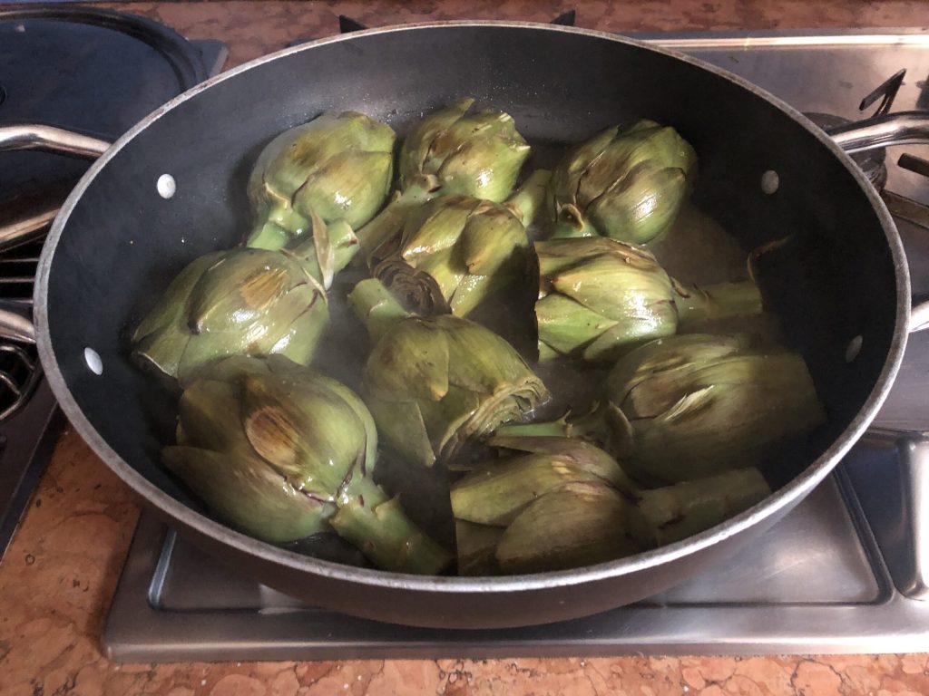 Einige Esslöffel heißes Wasser hinzufügen, falls nötig. Ich musste es hinzufügen. Sie können auch Gemüsebrühe verwenden. Den Deckel wieder aufsetzen und die Artischocken bei niedriger Hitze weitere 10/15 Minuten ziehen lassen. Am Ende sollten sie zart sein.