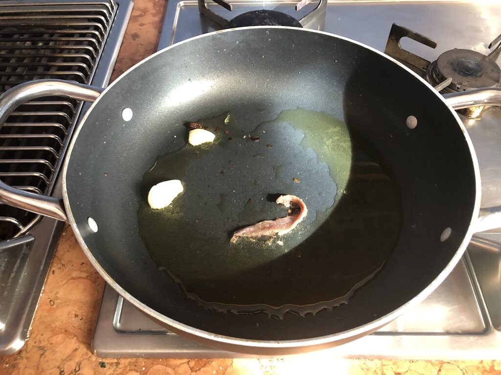 In einen Schmortopf ein paar Esslöffel Öl, eine Prise Chili, eine Knoblauchzehe geschält und halbiert und ein Sardellenfilet legen.