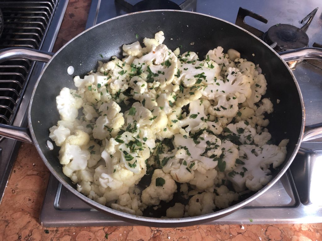 Am Ende der Garzeit mit gehackter Petersilie aromatisieren, die Hitze ausschalten und abkühlen lassen. Der Blumenkohl sollte gar, aber noch knackig sein.