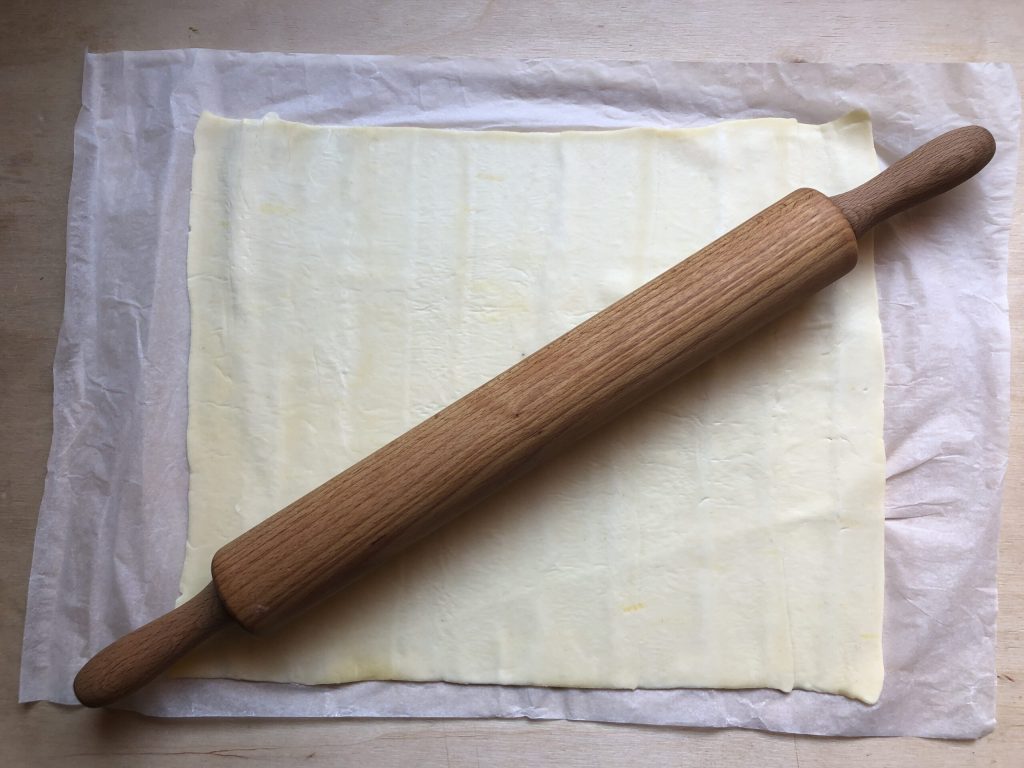 Den Blätterteig ausrollen und mit dem Ausrollstab darüber rollen.