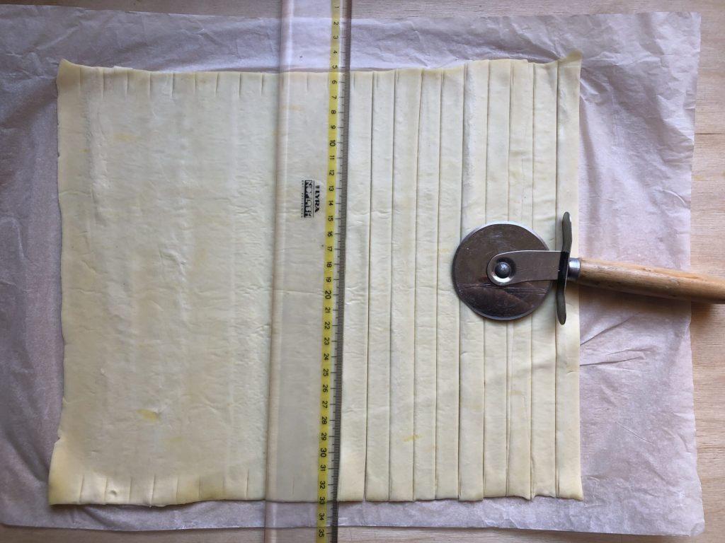 Mit einem glatten Rädchen (perfekt für Pizza), parallele Streifen zur kurzen Seite schneiden, etwa 1,5 cm breit. Ich habe ein Lineal als Führung verwendet.