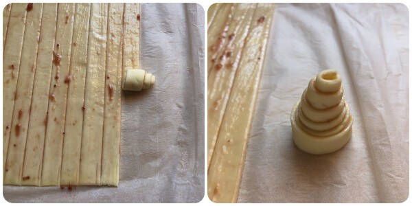 Nun jeden Streifen aufrollen, um eine kleine Pyramide zu erhalten. Am Ende mit leicht angefeuchteten Fingern die Enden verschließen. Die Pyramiden nicht zu hoch machen, sonst fallen sie beim Backen zusammen. Ich habe einen Versuch gemacht und das Ergebnis können Sie im letzten Foto dieses Artikels sehen.