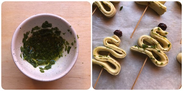 Den Blätterteig ausrollen, indem er auf dem in der Packung enthaltenen Backpapier bleibt, und die Hälfte mit grüner Olivenpaste bestreichen (auch schwarze Olivenpaste ist in Ordnung, vielleicht ist sie leichter zu finden).