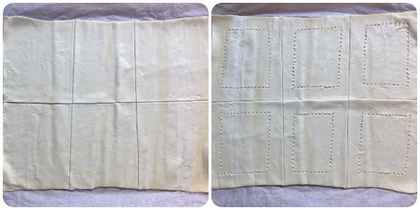 Das Rechteck des Blätterteigs ausrollen, vorsichtig mit der Teigrolle darüber gehen, dann in 6 Rechtecke teilen und mit den Zinken einer Gabel den Rand jedes Blätterteiggebäcks abgrenzen, wie auf dem Foto gezeigt.