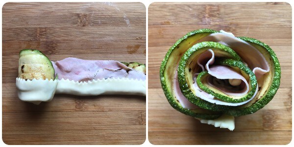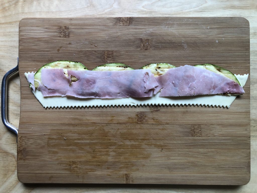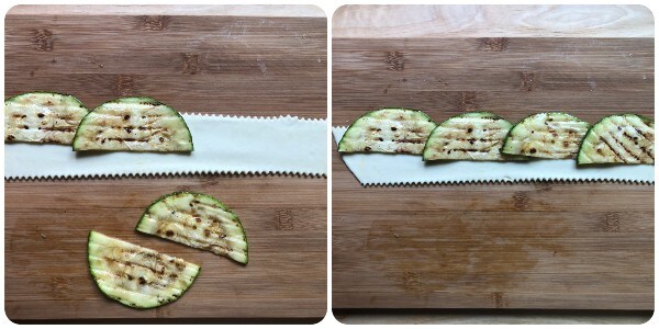 Die gegrillten Zucchinischeiben halbieren und auf den oberen Teil des Blätterteigstreifens leicht überlappend legen, wie auf dem Foto gezeigt: der runde Teil sollte aus dem Blätterteig herausragen.