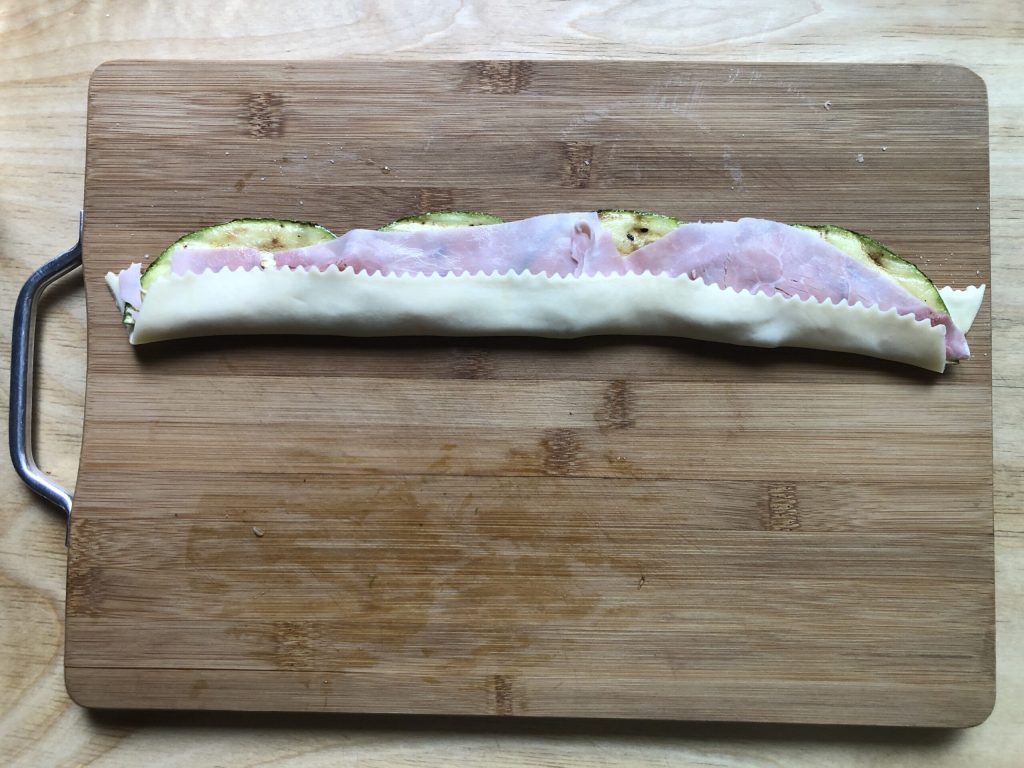 An diesem Punkt den unteren Teil des Blätterteigs (der nicht gefüllte) auf den gefüllten Teil umklappen, wobei die Bögen der Zucchini herausragen. Dann entlang der gesamten Länge des Streifens drücken.