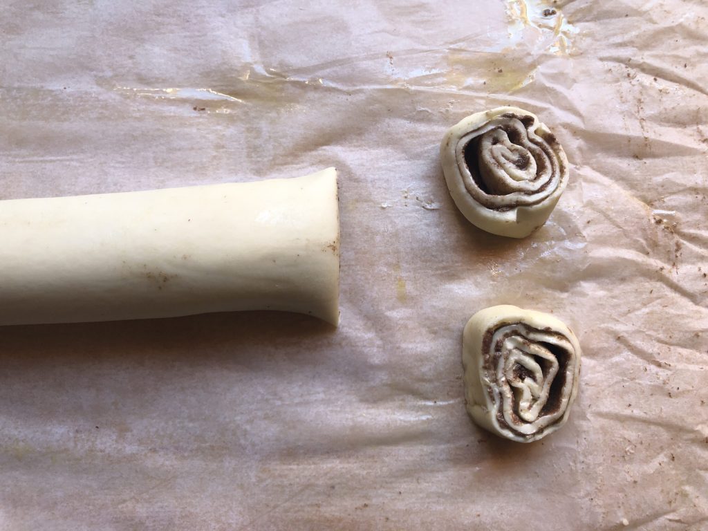 Nach der Kühlzeit die Rolle in Scheiben von etwa 5–6 mm Dicke schneiden. Beim Schneiden kann die runde Form verloren gehen. Versucht, sie mit den Fingern wieder zu formen.