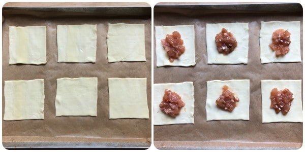 Nach dieser Zeit die 6 nicht geschnittenen Quadrate in ein mit Backpapier ausgelegtes Backblech legen und in die Mitte jedes Quadrats einen Löffel Fruchtkompott geben.