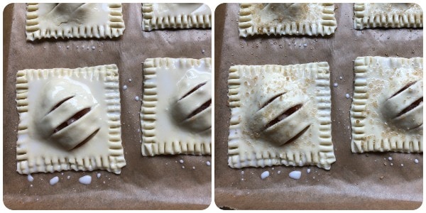 Nach dieser Abkühlzeit das Blech aus dem Kühlschrank nehmen, die Taschen mit etwas Milch bestreichen und mit wenig braunem Zucker bestreuen