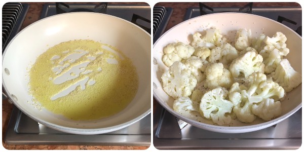 Sobald sie geröstet sind, ein paar Esslöffel Öl dazugeben sowie die Blumenkohlröschen und mit einer großzügigen Prise Salz und reichlich frisch gemahlenem schwarzem Pfeffer würzen.