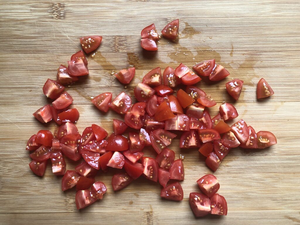 In der Zwischenzeit auch die Kirschtomaten waschen und in Stücke schneiden.
