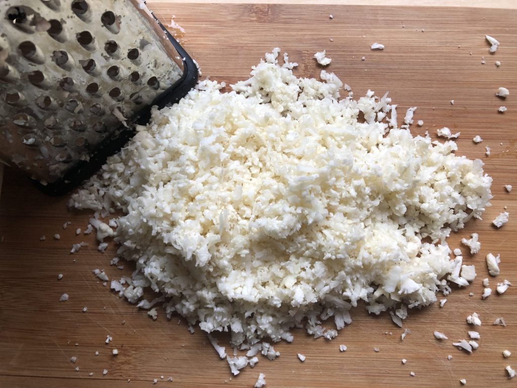 Den Blumenkohl waschen, gut abtrocknen und mit einer groben Reibe in Krümel reiben.