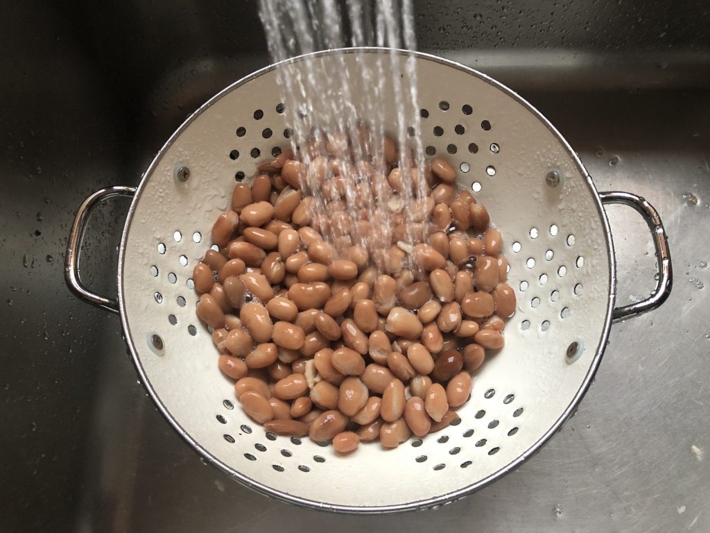 In der Zwischenzeit die Borlottibohnen aus ihrer Konservierungsflüssigkeit abtropfen lassen und gründlich unter fließendem Wasser abspülen.