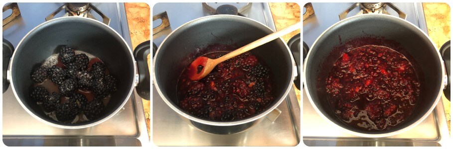 Legen Sie anschließend ein feinmaschiges Sieb über den Topf, der für das Kochen der Brombeeren verwendet wurde, und filtern Sie die Mischung, um alle Kerne zu entfernen. Sobald eine weiche Sauce entstanden ist, lassen Sie sie vollständig abkühlen. Ich habe sie am Vortag zubereitet.