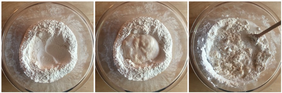 In der Zwischenzeit das Mehl in eine große Schüssel geben und mit einem Holzlöffel eine Mulde in der Mitte formen.
