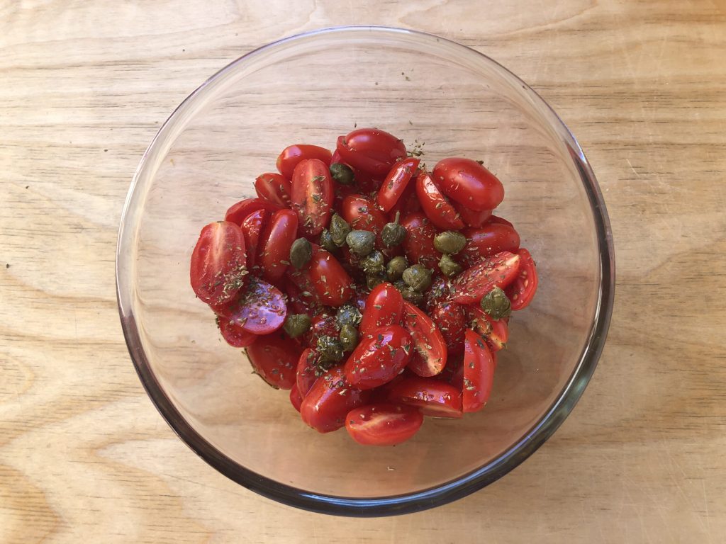 • In eine Schüssel geben und Kapern hinzufügen: Sowohl die in Salz eingelegten als auch die in Essig eignen sich hervorragend. In beiden Fällen unter fließendem Wasser abspülen und gut trocknen.