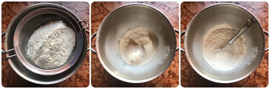 Mit einem Sieb mit feinen Maschen die beiden Mehlsorten in die Schüssel der Küchenmaschine sieben, dann die Trockenhefe und den Zucker hinzufügen und mit einem kleinen Schneebesen verrühren. Um die Entsprechung zwischen Trockenhefe und frischer Hefe zu berechnen, klicken Sie HIER.